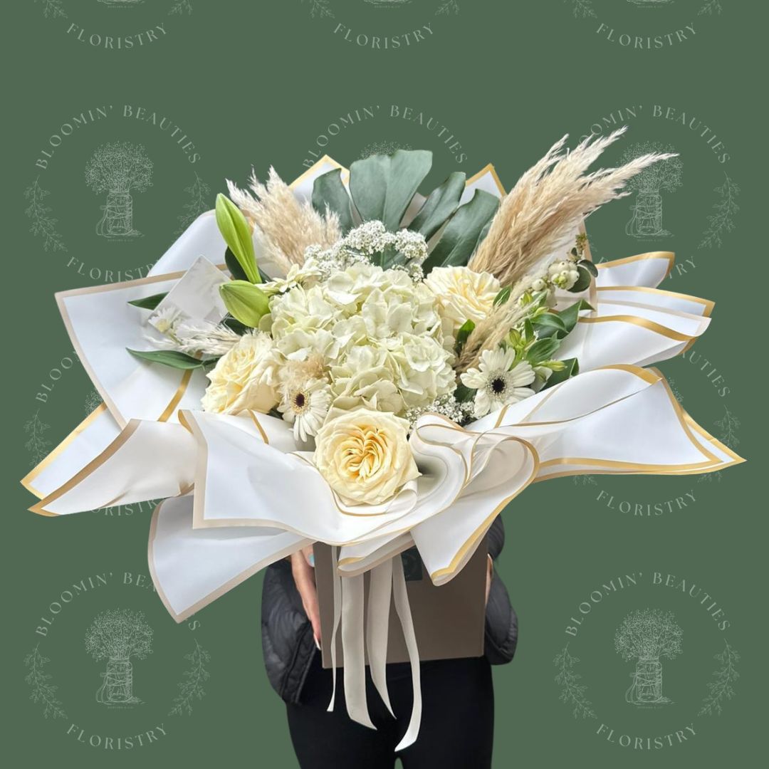 Indulge in the timeless elegance of our boxed fresh flowers, lovingly arranged and presented in water for prolonged freshness. Please note that while we strive to recreate the image, seasonal availability may lead to variations. Feel free to contact our shop beforehand to discuss any specific preferences or requirements. For size reference the pictured bouquet is size Large.